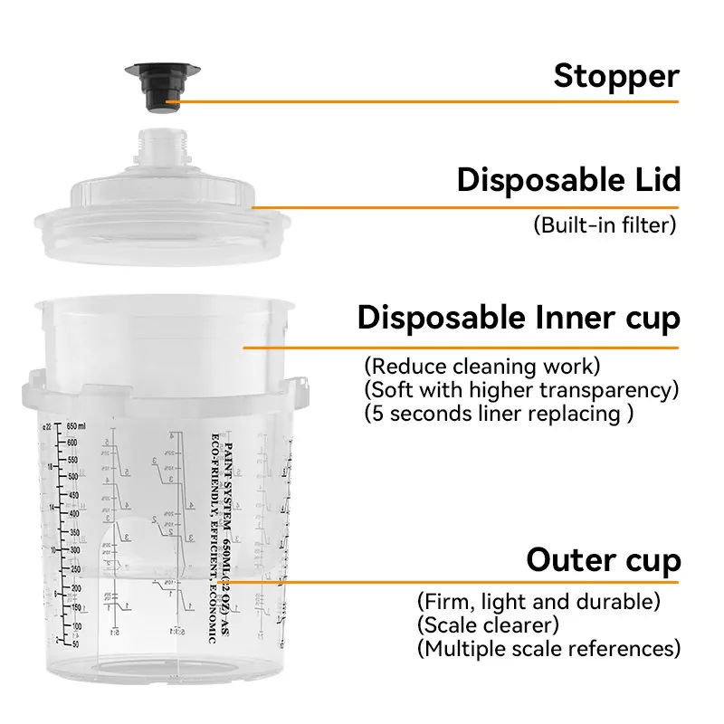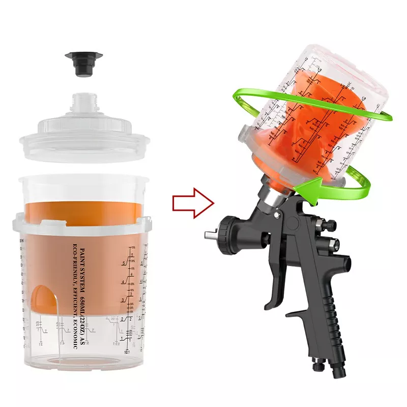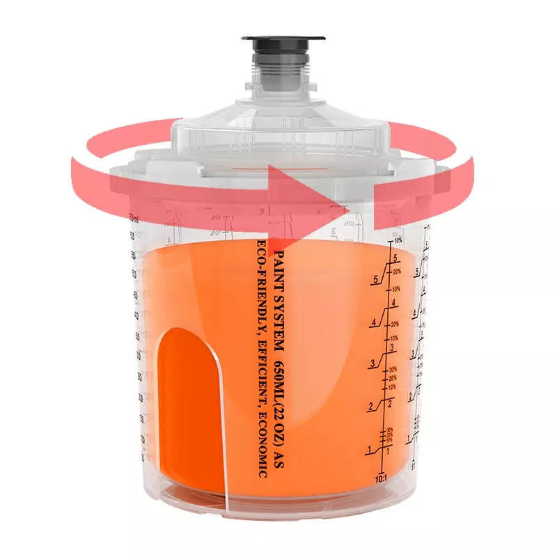 650ml tek kullanımlık püskürtme silah bardağı, dış fincan kenarında entegre bir snap-on tasarıma sahiptir. Kapak, 1/4 tur saat yönünde bükerek dış kapağa kilitlenir ve iç kapağı değiştirmek için gereken süreyi daha da azaltır. Bu, onları özellikle çok renkli püskürtme için uygun hale getirir ve boya rengi değişim verimliliğini artırır. Yakın olmayan tasarım ayrıca, kayıp yaka nedeniyle bardağın kullanılamaz olma olasılığını da ortadan kaldırır.