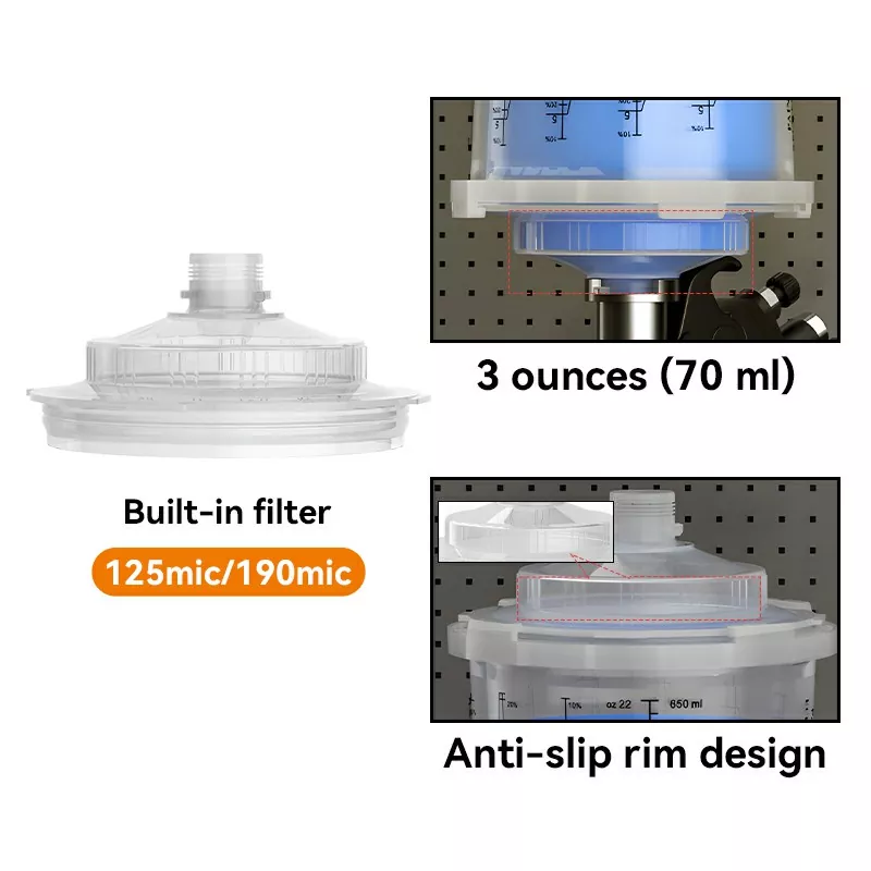 ◆ Çift katmanlı kapak, filtrenin altında 3 onsa kadar boya tutar, bu da püskürtme sırasında boya tükürmesini azaltırken akışı ve kıvamı iyileştirir.
