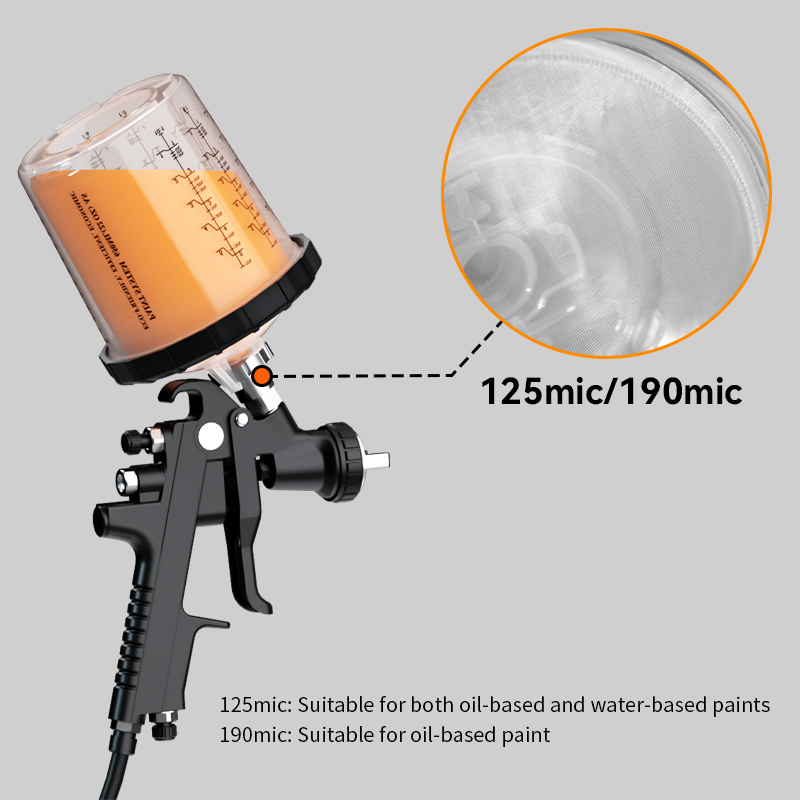 • Üstün boya kalitesi için dahili entegre filtreler: Tek kullanımlık püskürtme kabı kapağında yerleşik 190μ (yağ bazlı boya) ve 125μ (su bazlı boya) filtreler bulunur; püskürtme sırasında yabancı maddeleri etkili bir şekilde filtreler ve boya parlaklığını %20 artırır.